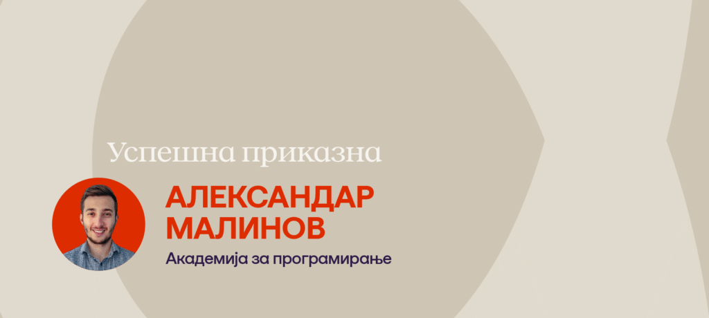 Јас сум Александар Малинов, имам 28 години и сум од Скопје, по струка сум дипломиран правник на Универзитетот “Св. Кирил и Методиј”. Пред да се запишам на академијата за Web Development во Avenga Academy (поранешено СЕДЦ), имав повеќе работни искуства во неколку дејности, каде што не беа исполнети моите финансиски и професионални очекувања. Затоа се одлучив да направам голем чекор и да направам промена во мојата кариера, што на крајот излезе како една од најдобрите одлуки во мојот живот.